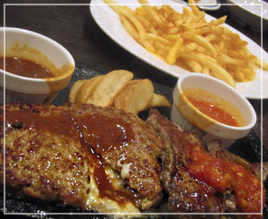 どどーんと鉄板に乗ってきたハンバーグと薄切りステーキも、なかなかの迫力だった。人気商品の「チーズインハンバーグ」は相変わらず良い感じにチーズが中から溢れてくるし、ガーリックソースを選択したステーキも、正直なところ「ああ熟成肉の美味しさだわ!」とかいうのはあまり感じられなかったものの、「肉食べてます!」感はしっかり味わえたから、幸せ。フライドポテトをソースにびたびたつけながら食べるのも美味しかった。